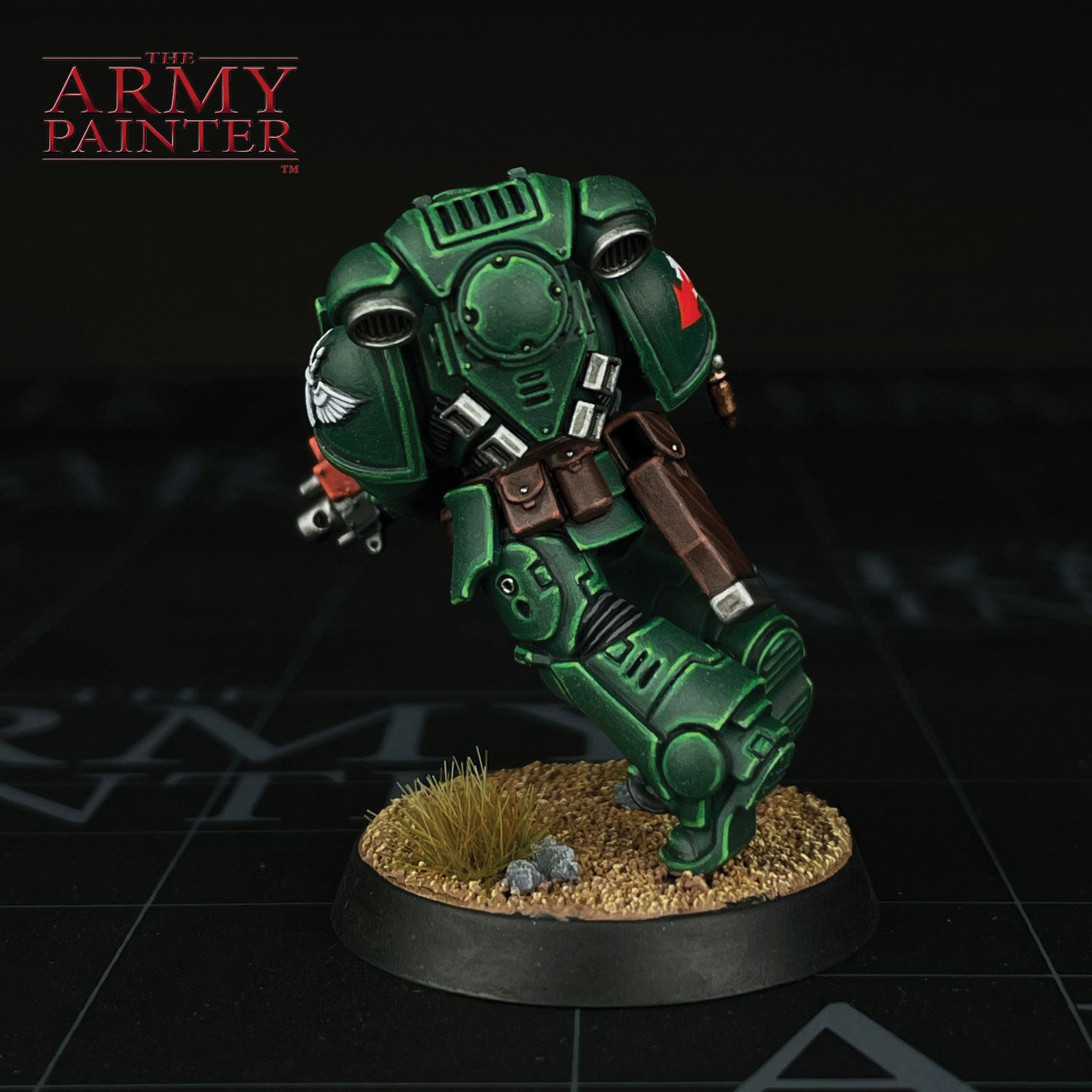 Next, I decided to add a bit more definition, using a 50/50 mix of Warpaints Fanatic Matt Black and Angel Green. This was painted into all of the recesses on the armour. You can tidy back up with pure Angel Green if needed.