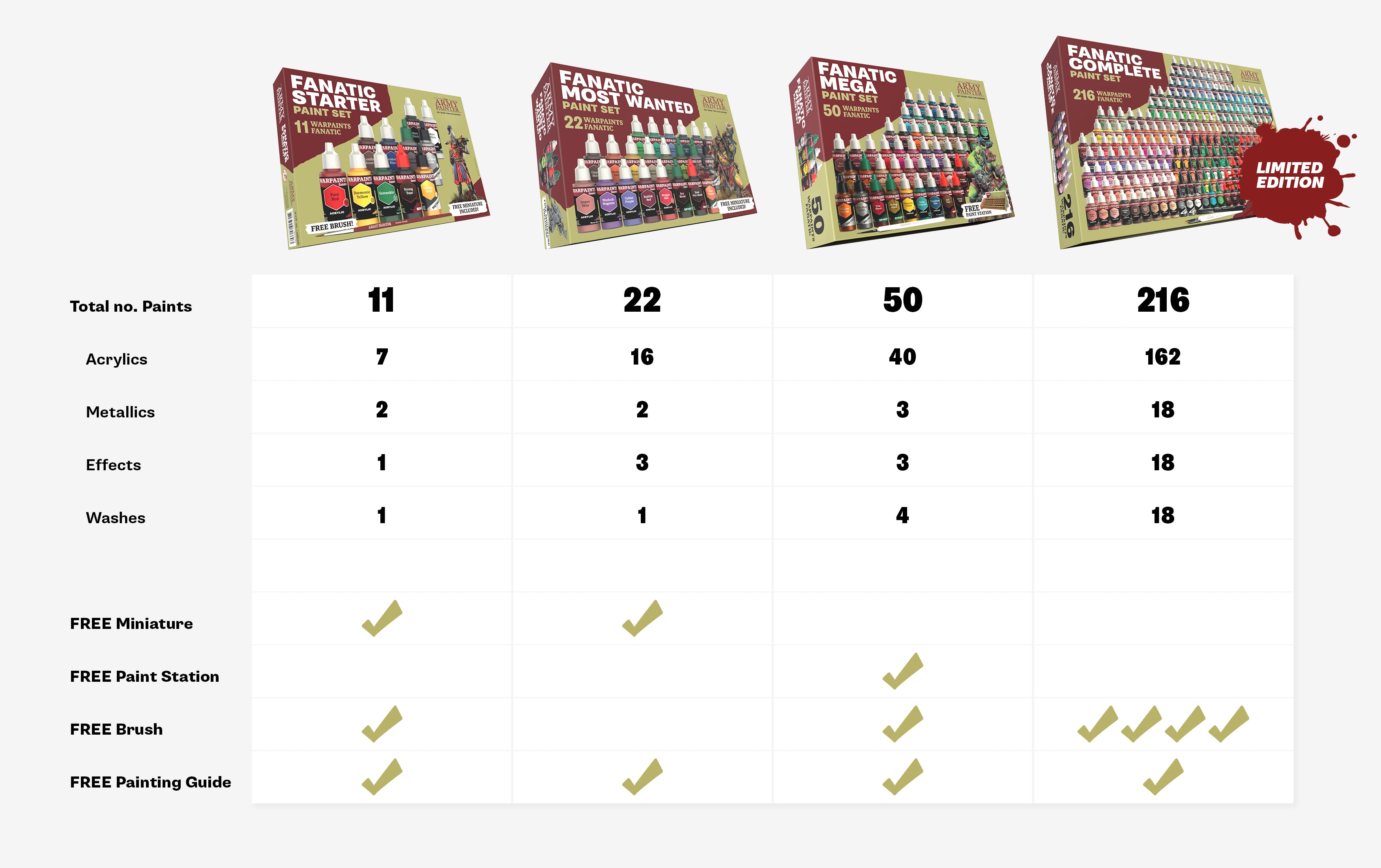 To help you get the full picture, here’s an overview of the Warpaints Fanatic Paint Sets and their contents: