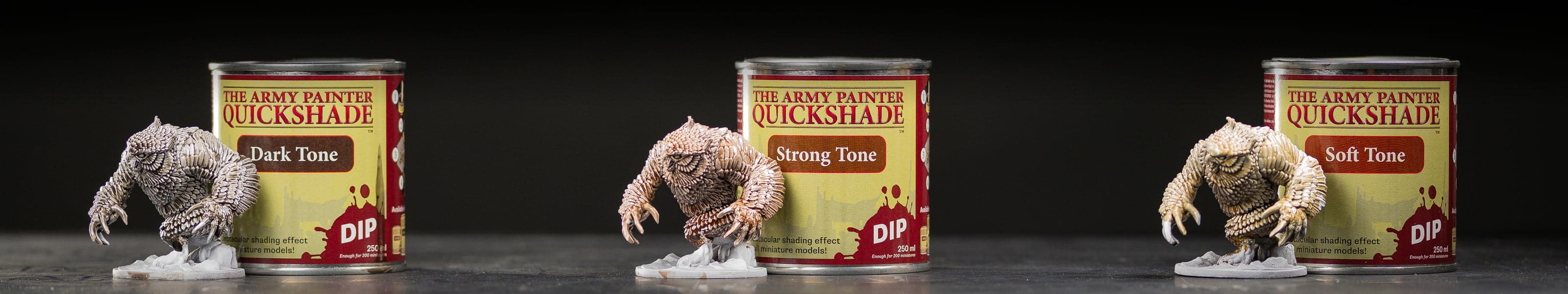 Just allow 24hrs to dry and apply a coat of Anti-Shine Matt Varnish for best results. Quickshade Dip is available in three tones; Dark Tone, Strong Tone, and Soft Tone to suit a variety of army colours and styles.