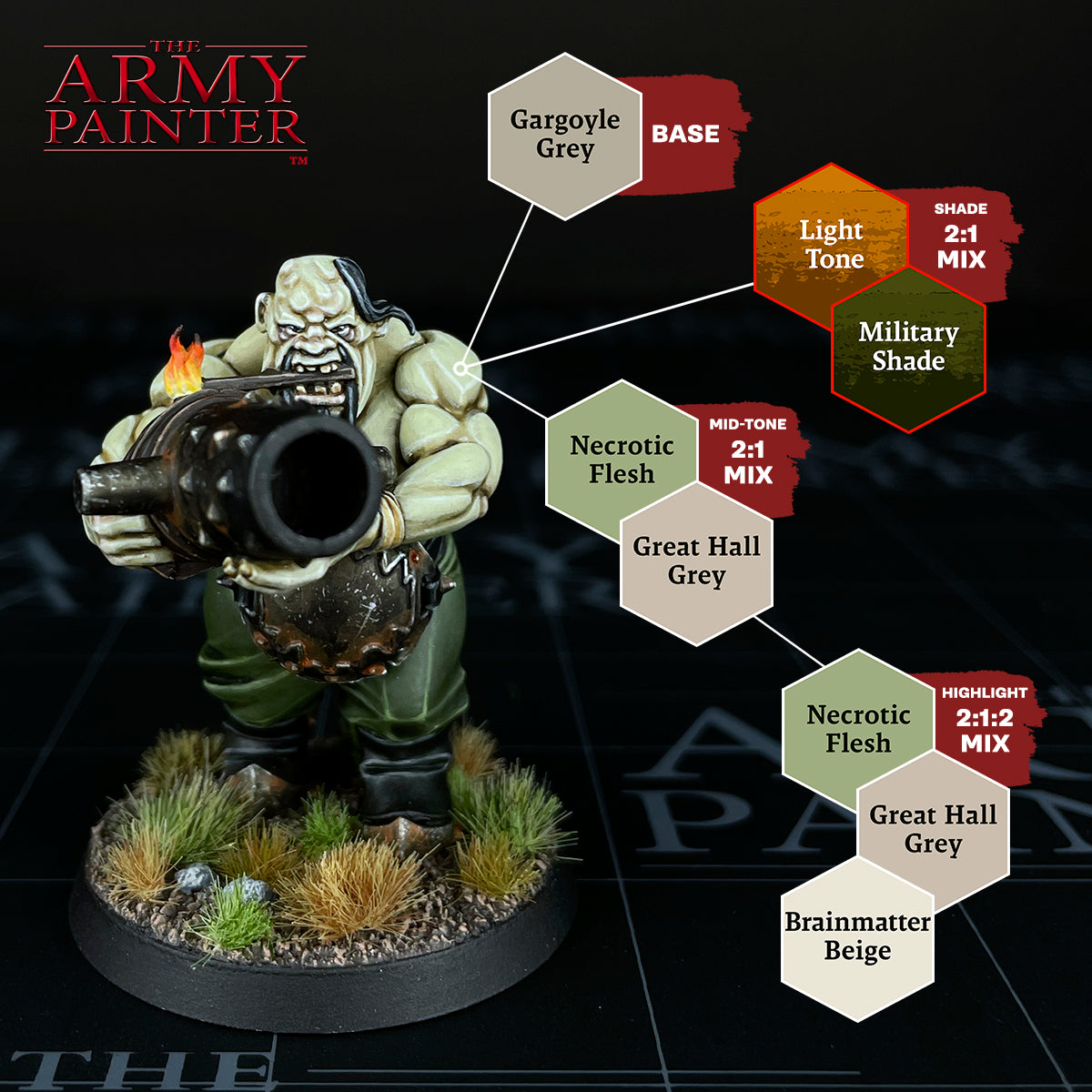 The skin tone I had picked for my Ogors was a rather unique and sickly colour, so had no direct companion within the Warpaints Fanatic range. Instead I picked the closest colour, which was Great Hall Grey, and then worked from there. Through some testing, I needed to mix in Necrotic Flesh to get that green tinge. I then used a custom shade blend of Light Tone and Military Shade Wash. This was further strengthened in some recesses with Strong Tone on its own. I finished it all off with Brainmatter Beige mixed into the mid-tone for the highlights.
