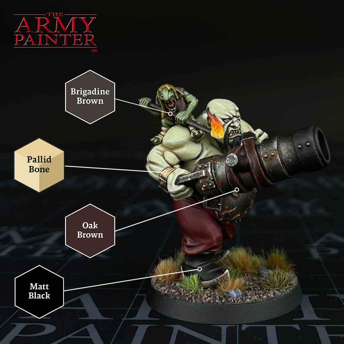 Not all of the colours were as involved as the skin however. With things like wood and leather I just picked an appropriate brown from the Warpaints Fanatic range, in this case Brigadine Brown and Oak Brown respectively. Since these are smaller areas of colour, it's easier to get away with deviations from the rest of the army. Even from a lore perspective, it's easy enough to imagine the Ogors using different sources of wood and leather and not being as uniform with it.